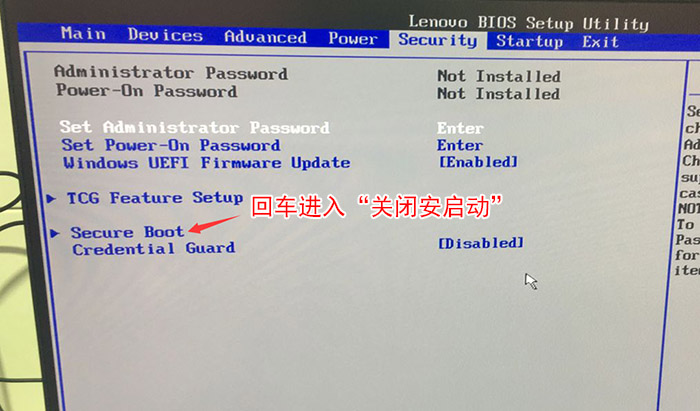 1、在开机或重启到Lenovo画面自检处,快速、连续多次按键盘的 F1,按方向键切换到 Security ,选择 Secure Boot 回车设置成 Disabled ;